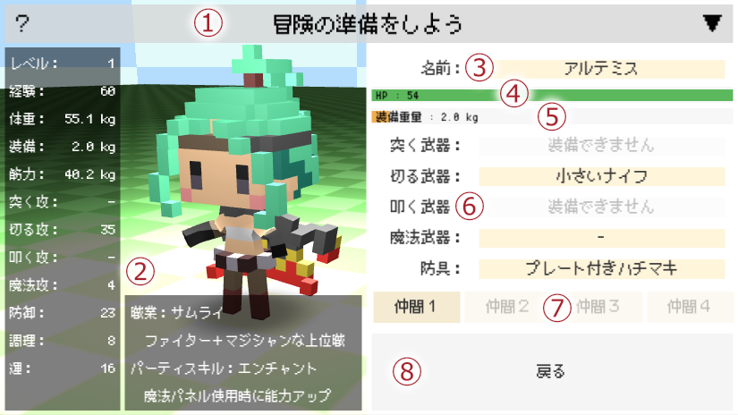 各キャラの装備を変更したりステータスを確認できる画面です。