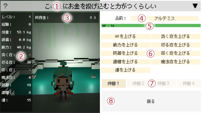 ボタンを押すと必要金額が表示され、OKするとステータスアップが行われます。