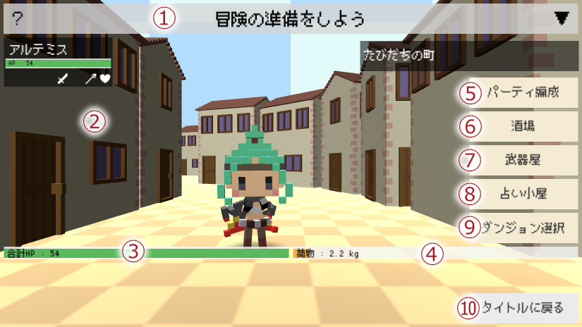 町の各画面に移動するためのホーム画面です。